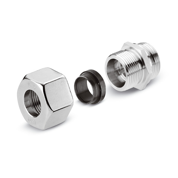 Voor stationaire HD-/HDS-apparaten: verloopkoppelstuk van RVS, bestaande uit een dubbelnippel, wartelmoer en knelring. Voor het aansluiten van de leidingen op de afdichtkraan.